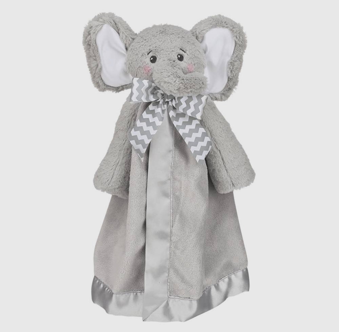 A cuddly elephant security blanky. Approximately 18x18”, trimmed in satin, perfect for personalization, which is included in the price!